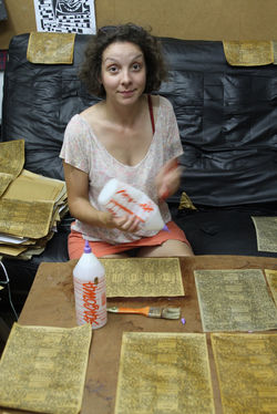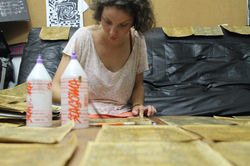 En effet, l'emballage est également fait à partir de matériaux recyclés. Francisca reçoit de grandes enveloppes A5 en papier kraft déjà utilisées dans une entreprise. Il est nécessaire de les trier, les découper, les imprimer avec le motif adéquat, et les enduire de colle sur les deux faces afin qu'une fine couche protégeant le savon de l'humidité se crée. C'est ce que nous faisons, nous emballons les savons et les étiquetons. Nous aiderons Francisca plus de 15heures dans cette tâche, nous permettant de nous rendre compte de la charge de travail que cela représente pour elle et de la nécessité d'avoir un associé à ses côtés.